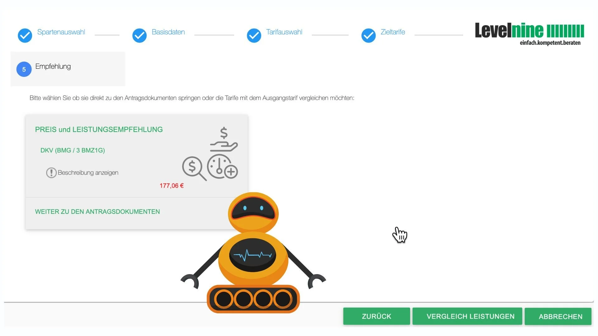 • Der Robo-Advisor erkennt detailliert die Leistungen des Ausgangstarifes und sucht vollautomatisch nach vergleichbaren Tarifen.